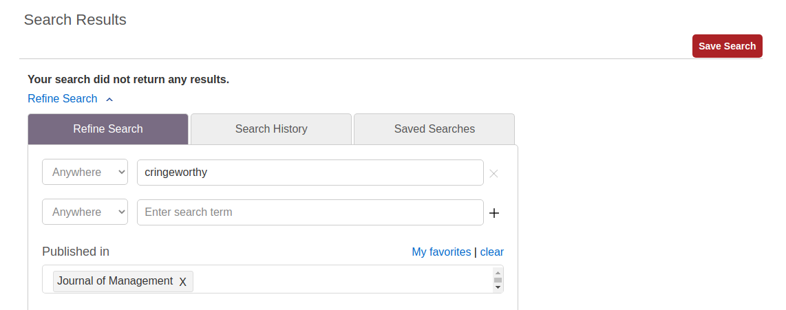 If you go to the Journal of Management1 and you search for the word cringeworthy (and all its possible variations), you get zero results: