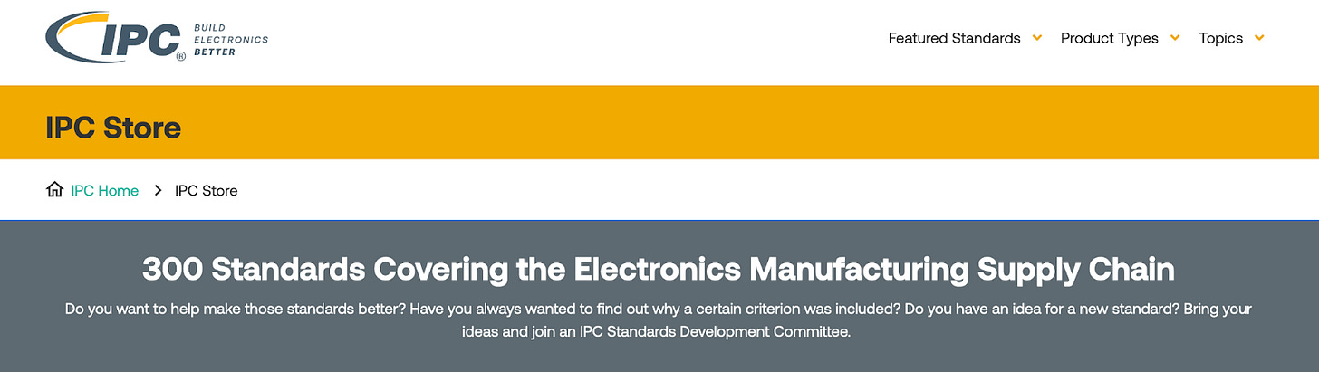 And now that we are into topics like designing electronics in-house, then you better keep an eye on the IPC standards of course, which will specify things from how you need to assign footprints for surface-mount components in a PCB to how to fold a through-hole resistor leads with a plier or manually solder a capacitor. Just 300 standards; easy peasy.