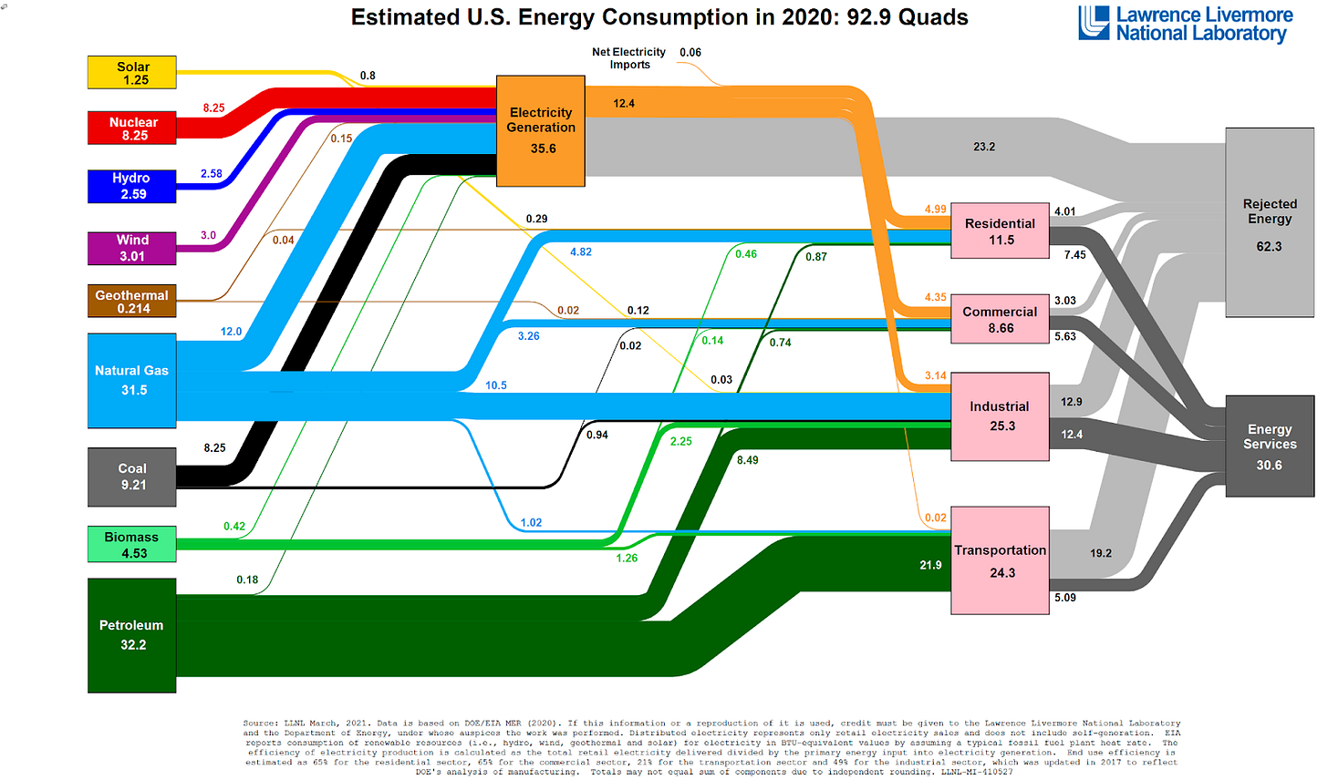 Transportation is the inefficiency superstar in all those Sankey charts shown above. A nearly empty bus with only one passenger screams inefficiency, but it sort of makes sense when you a. understand that buses cannot predict demand—upon the slightest probability of a single passenger requiring transportation, the buses have to be kept running, and b. even if they could predict demand (as for examples airlines can), transportation has been a strong economic factor: if people can’t go to work or travel for business, the economy dies. Therefore, our economies rely on that inefficient sector—it is a necessary evil. See the graphs above—80% of the energy in transportation is wasted, in all graphs. Has the experience during the COVID-19 pandemic and the surge of remote work come to finally challenge this paradigm? Time will say.