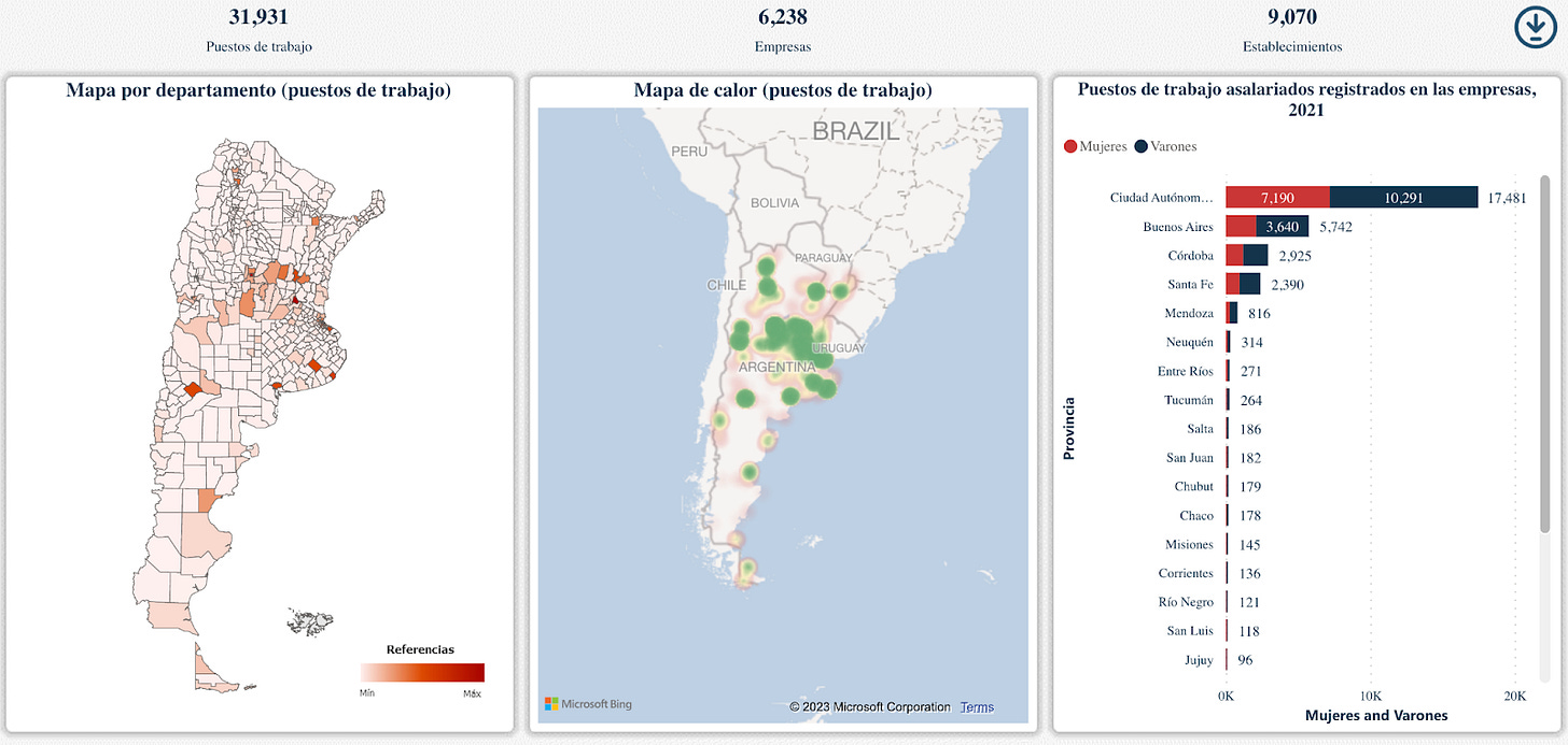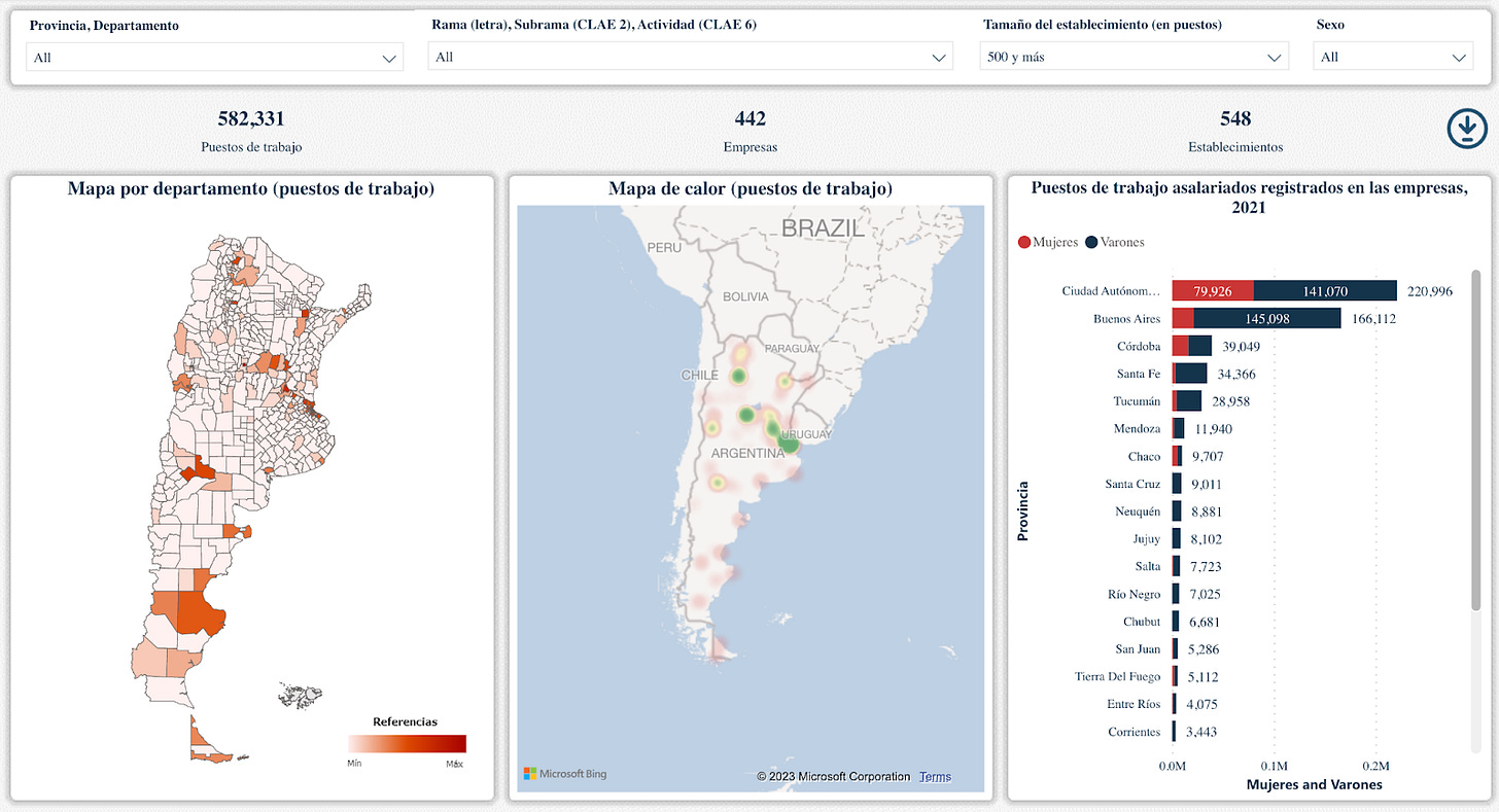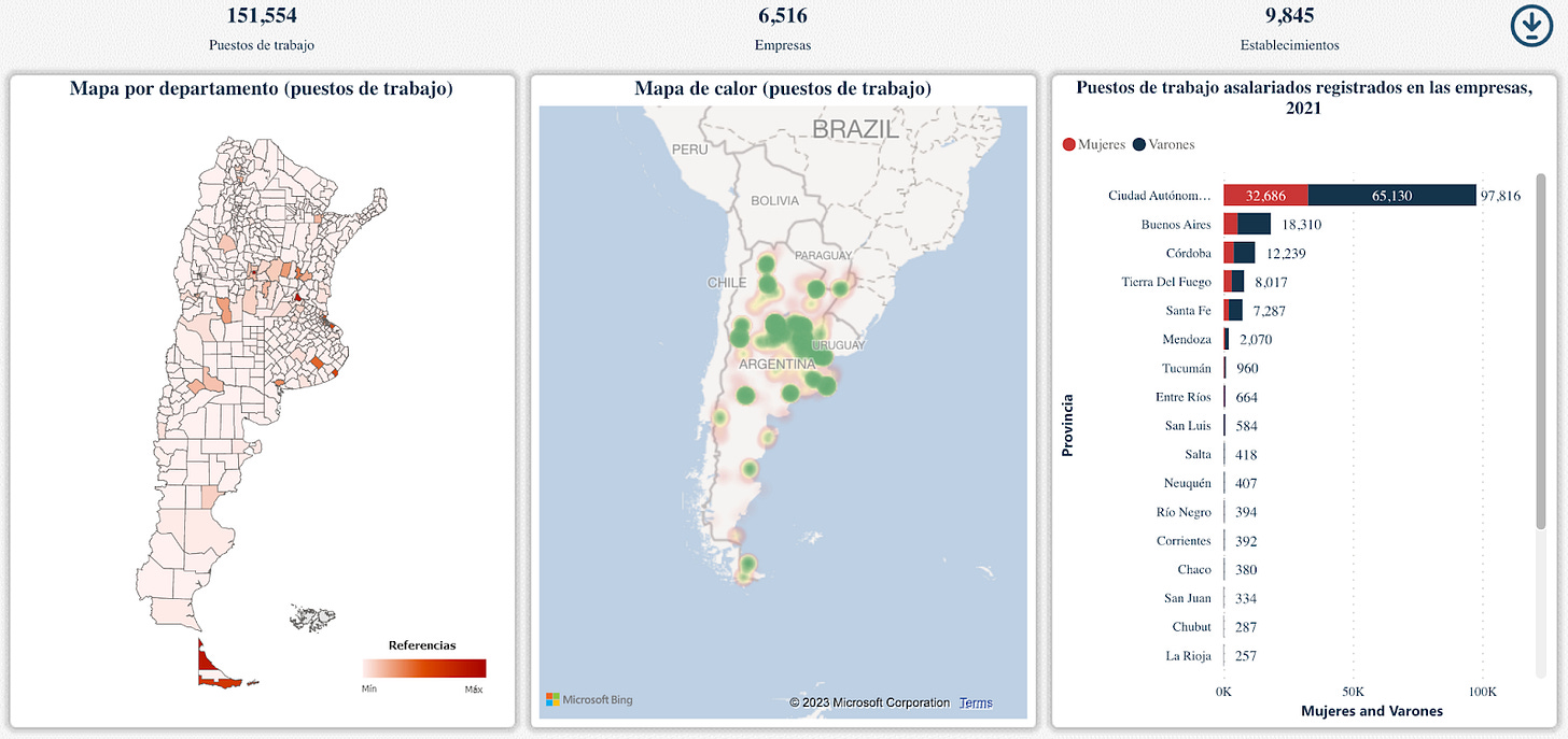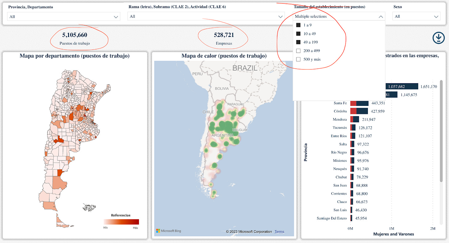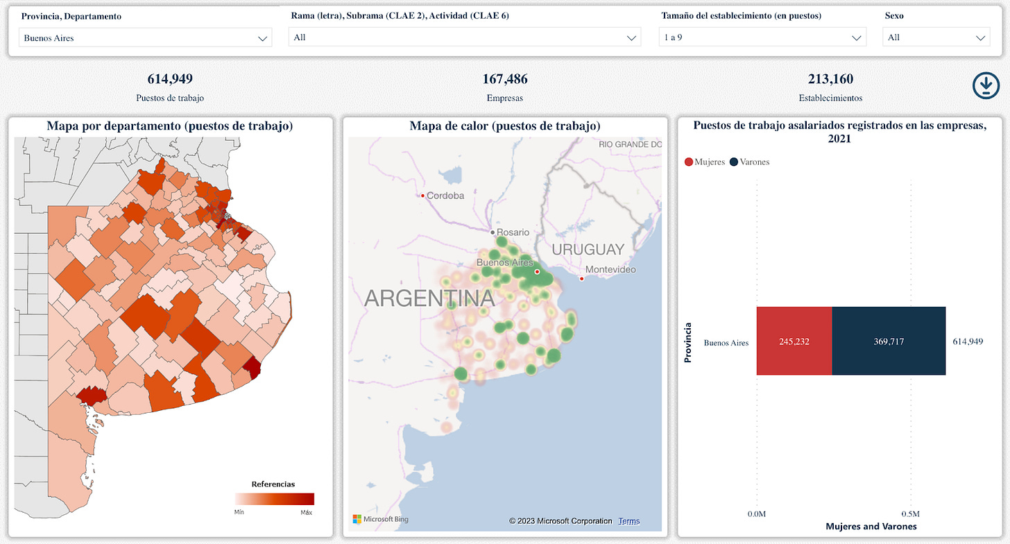Compartí hace un tiempo en LinkedIn un trabajo hecho por el Ministerio de Economía donde se creó un mapa interactivo productivo-laboral de Argentina, con información georreferenciada de establecimientos productivos (registrados). El mapa incluye empresas privadas y la mayoría de las empresas públicas o con participación estatal mixta. El mapa no incluye entidades públicas que no sean empresas públicas. Los datos toman el promedio anual de 2021 y la fuente primaria de información es la AFIP a partir del registro de relaciones laborales que surge del Sistema Integrado Previsional Argentino (SIPA). Para más información respecto a la metodología, ver acá.