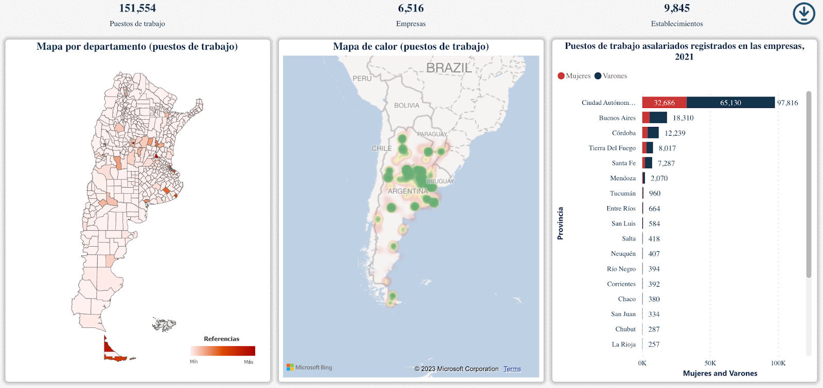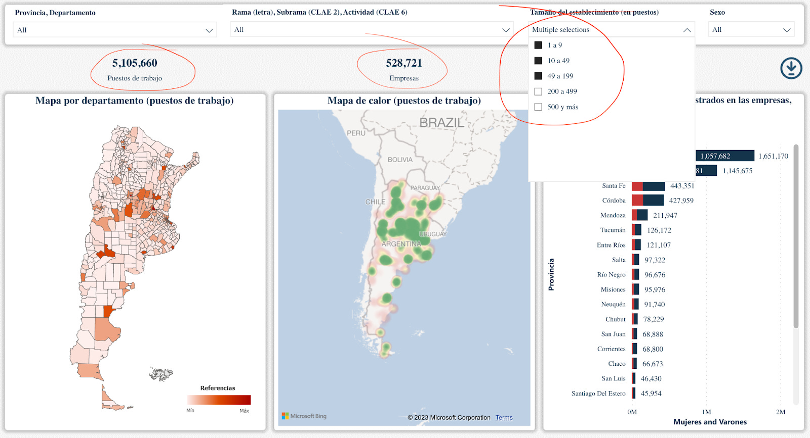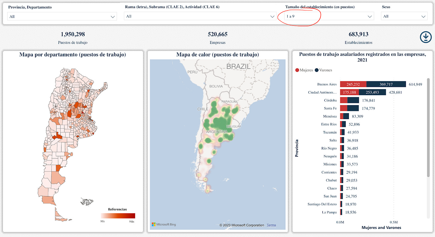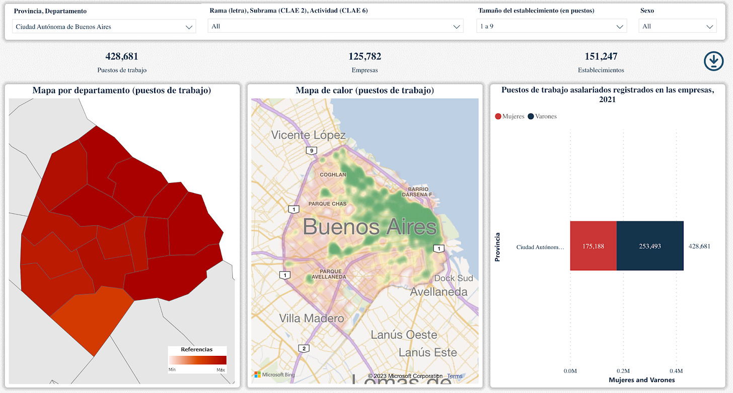 Compartí hace un tiempo en LinkedIn un trabajo hecho por el Ministerio de Economía donde se creó un mapa interactivo productivo-laboral de Argentina, con información georreferenciada de establecimientos productivos (registrados). El mapa incluye empresas privadas y la mayoría de las empresas públicas o con participación estatal mixta. El mapa no incluye entidades públicas que no sean empresas públicas. Los datos toman el promedio anual de 2021 y la fuente primaria de información es la AFIP a partir del registro de relaciones laborales que surge del Sistema Integrado Previsional Argentino (SIPA). Para más información respecto a la metodología, ver acá.