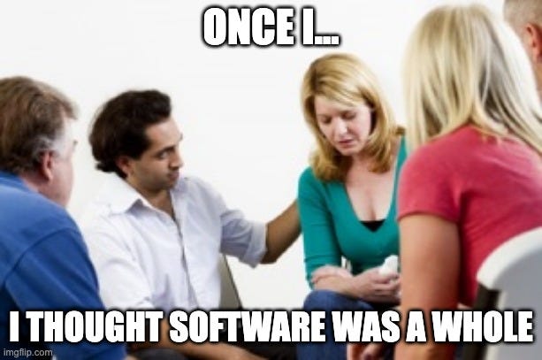 And, yeah, one small thing: software is never a whole but a PART. Like bolts are. Fight me.