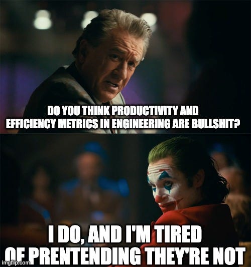 There were attempts to measure and report lines of code per day. Another attempt to chronometrate (!) “chair hours”. There were spurious spreadsheets to be filled. In all these bizarre experiments, time would always be the main variable these artificial metrics were pegged to. You could see him preparing intricate plots in his office—actually, a cubicle inside the mezzanine. Sooner than later, he and his supervisors realized the lack of usefulness of the fabricated metrics—it was mostly random noise, not helping to describe or predict anything. The idea of gauging engineering was eventually dropped.