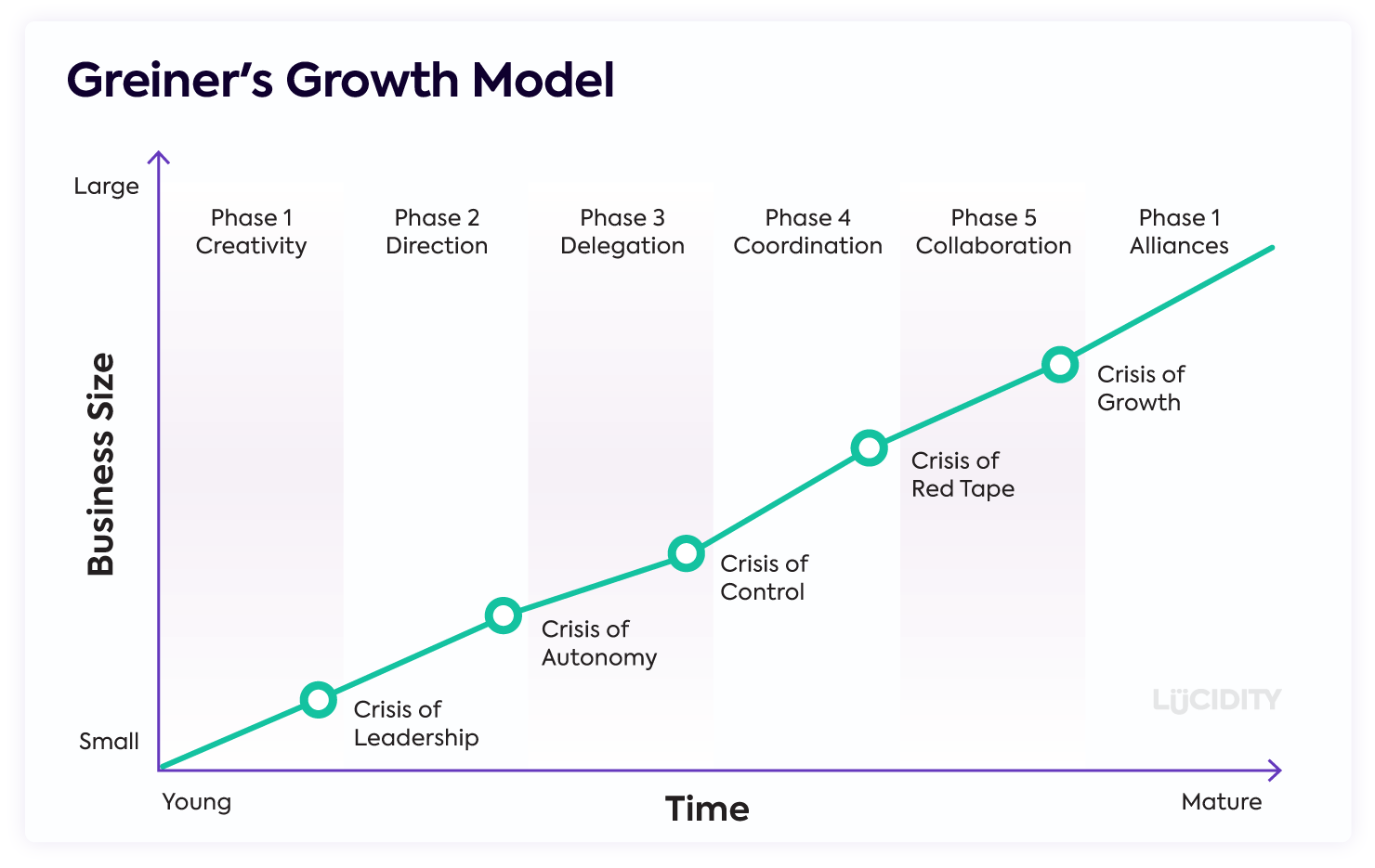 Framework says that, as you grow, you undergo 5 phases: creativity, direction, delegation, coordination, collaboration, with an extra phase called “alliances”, whatever that means. What marks the transition between phases are “crises” called: crisis of leadership, autonomy, control, red tape, growth.