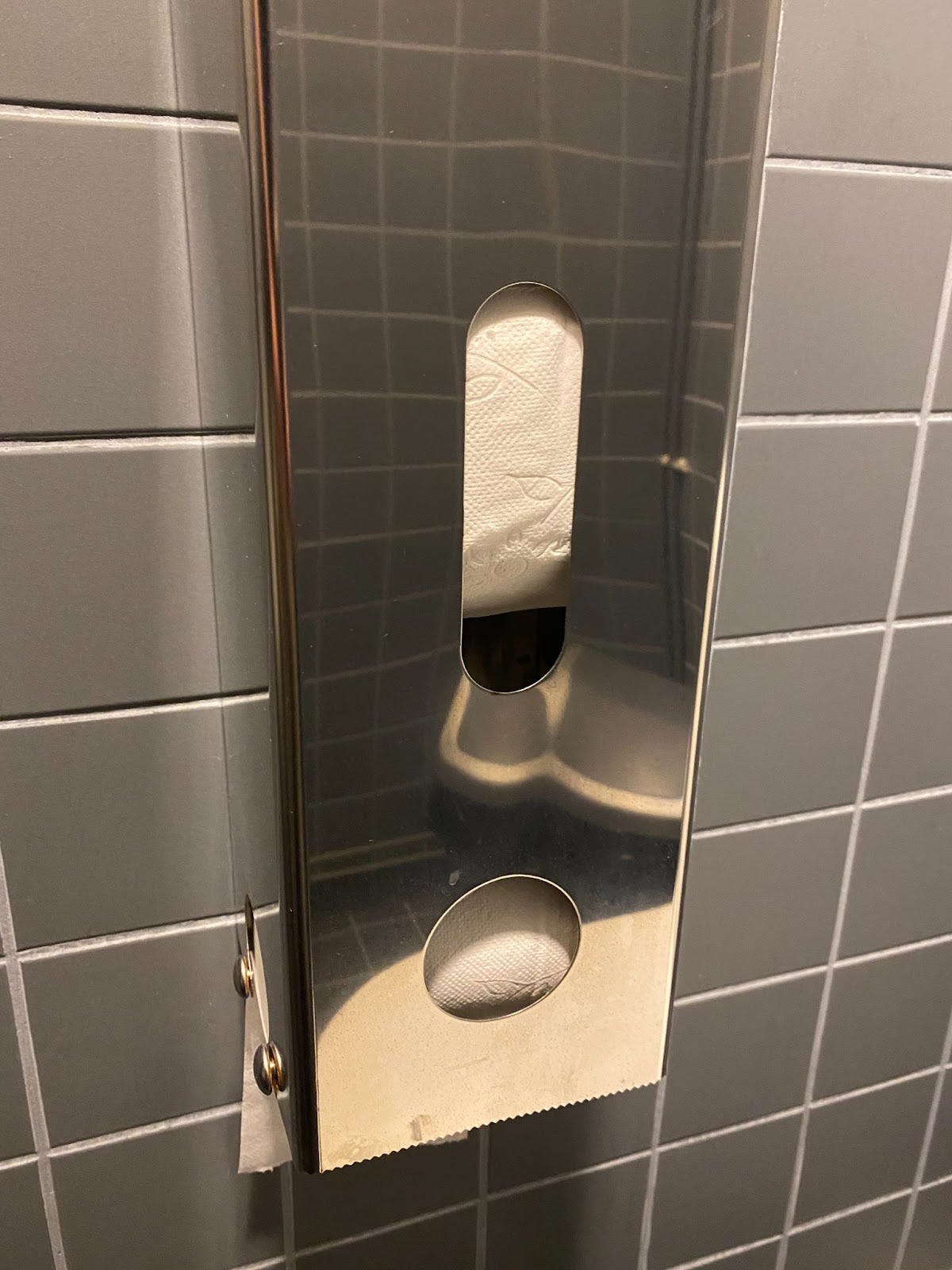 And to wrap up my introductory and random rant on toilets as emporiums of half-witted design, one of the most annoying designs ever, the mysterious metallic toilet paper dispenser box: