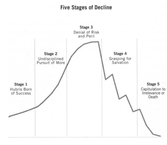 Jim Collins2 has written extensively about the rise and fall of companies. In his “How the Mighty Fall: And Why Some Companies Never Give In”, he and his research team explain that companies tend to decline following five stages: